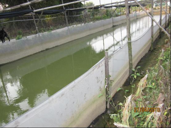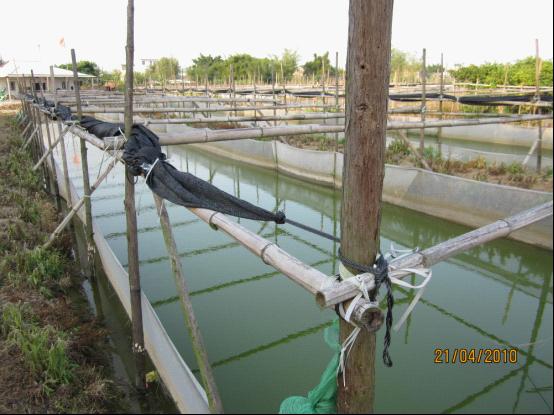 (2)土池围网精养模式:直接挖坑,上面用渔网围成长方形。土池规格一般有10(m)*13(m)、4(m)*23(m)和3.8(m)*27(m),面积在100(m2)左右。水深0.3~0.4m或者1m。