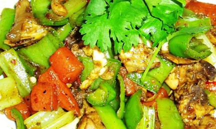 1. 将牛蛙宰杀洗净,改刀成小块;